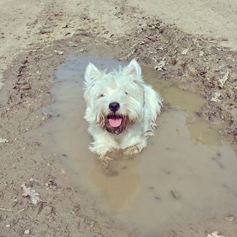 Tak jsme si takhle zajeli vláčkem (vláčky já moc rád) do Mlčechvost a udělali si procházku zakončenou v naší oblíbené hospůdce v Nelahozevsi, kde se páníčkové se mnou podělili o salátek (zeleninu já moc rád) a hurá dalším vláčkem domů. Během cesty nás překvapilo velmi horké počasí, slunko ne a ne zalézt, takže jsem byl velice rád, když jsem narazil na velmi lákavě vypadající louži plnou studeného bahna. Nadšen jsem se do ní vrhl, zalehl a nějakou chvíli by mě odtamtud nikdo nedostal ani na meruňky (a to je vážně miluju). Panička nejprve měla takový ten výraz "to už z něj nikdy nedostanu", ale když viděla můj spokojený výraz, byla už jen samý úsměv. :) Navíc já jsem v podstatě samočistíc...