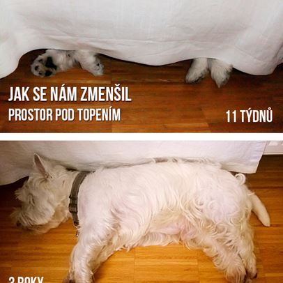 A prý, že westíci patří mezi malá plemena. Ani pod topení se nevejdu, jak jsem obrovský. A nebo že by to bylo tím, že se nám zvětšilo topení? Možná se nám zvýšila podlaha, těžko říct. Výsledek je ale citelně znát, musel jsem si najít jiná místa, kam se uklidit, když chci mít od všech a všeho klid.